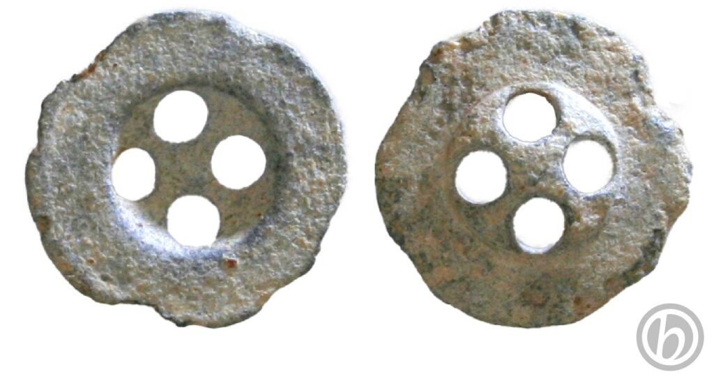 Probabile bottone di camicia dell’esercito britannico risalente alla prima guerra mondiale, non presenta scritte o simboli. Nella parte centrale concava sono ricavati 4 fori per il fissaggio. Il perimetro esterno è rovinato.