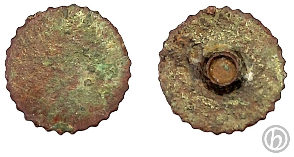 Probabile bottone o borchia. La superficie è liscia ed bordo dentellato: inferiormente manca l’occhiello (o il rivetto).