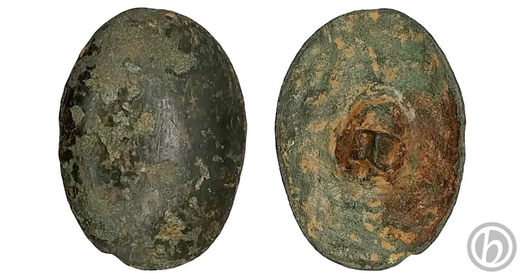 Probabile bottone o borchia. Presenta una superficie superiore convessa di forma ovale e inferiormente manca l’occhiello.