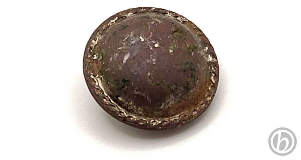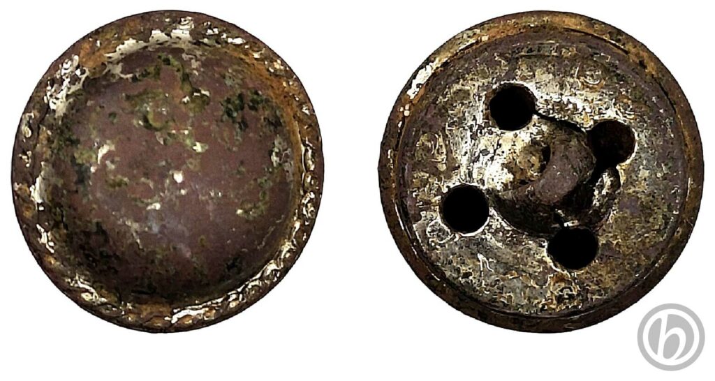 Probabilmente prodotto da un’azienda milanese, il bottone presenta ancora piccole parti della placcatura nichel. Il lato esterno è bombato ed ha una cornice decorata da un rilievo simile ad una catena. Nel lato interno sono presenti 4 fori ed un anello; leggibile l’incisione “MIRA DEP.” e “20“.