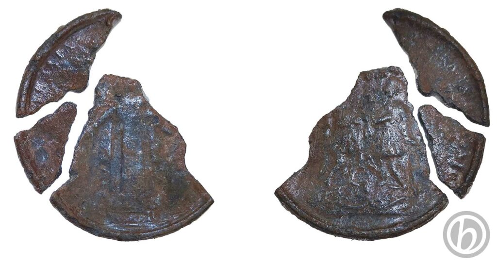 Tre frammenti di una probabile medaglia dal diametro di 32 cm. Consumata ed incrostata non risulta molto leggibile. Sono visibili le lettere “AIA” nel perimetro di un lato e nel centro sembra esserci una figura vestita con una tunica, in piedi con le braccia aperte. Nell’altro lato si distinguono due figure vestite di corte tuniche ma non si distinguono le lettere della scritta perimetrale.