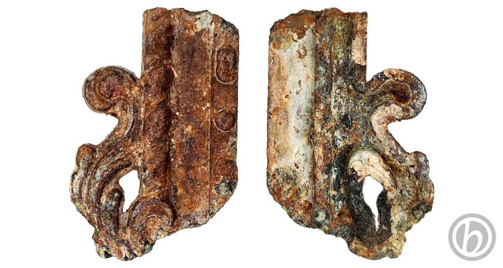 Frammento di fregio con tracce di placcatura bronzea nella faccia superiore. Visibile la decorazione ispirata al regno vegetale e quelle dei due profili in rilievo: in uno è inciso il motivo di una corda e nell’altro ci sono un punto tra due ovali in rilievo.