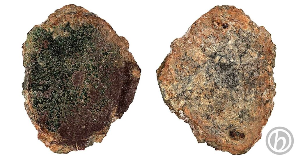 Probabile supporto per decorazione di forma ovale. Il bordo risulta rovinato e mancante di molte parti ma è ancora visibile la smussatura. Nella faccia superiore è presente un punto centrale dove forse veniva allineata la decorazione mancante. Nella faccia inferiore è visibile ciò che resta dei supporti della spilla.
