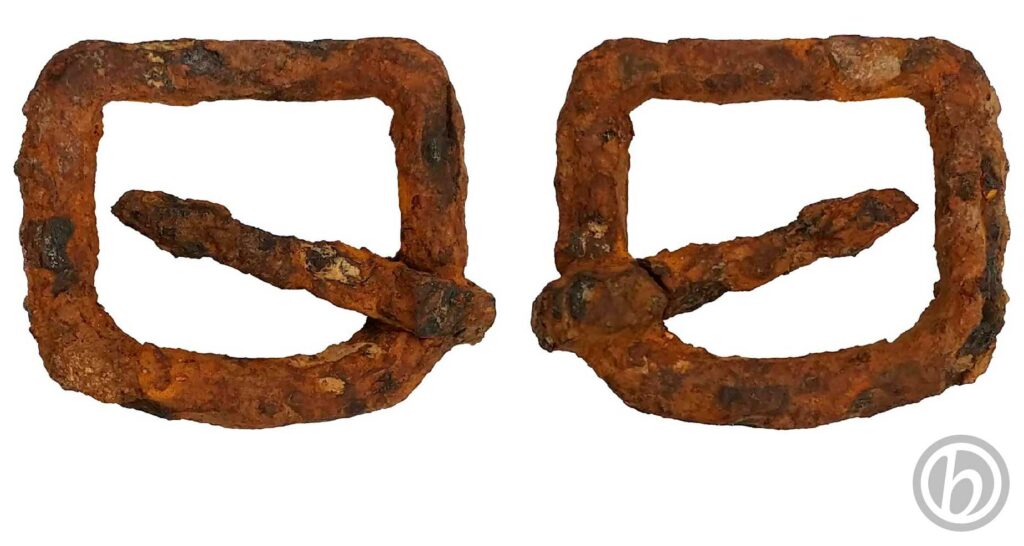 Realizzata in ferro, si presenta in uno stato di conservazione precario. Molto incrostata, ha ancora il suo ardiglione.