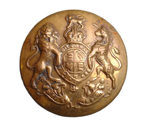 Bottone da uniforme militare britannica del periodo vittoriano o edoardiano (fine XIX – inizio XX secolo) realizzato probabilmente peltro o zinco.