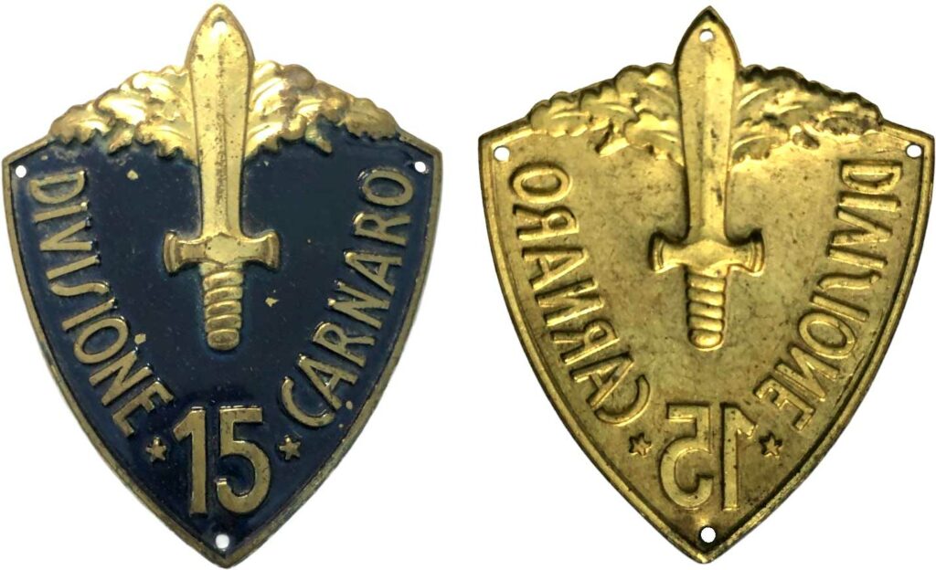 Realizzato in lamierino metallico dorato, aveva uno sfondo di colore blu con impresso numero e nome della divisione, al centro la raffigurazione di un gladio ed in alto delle fronde di quercia.