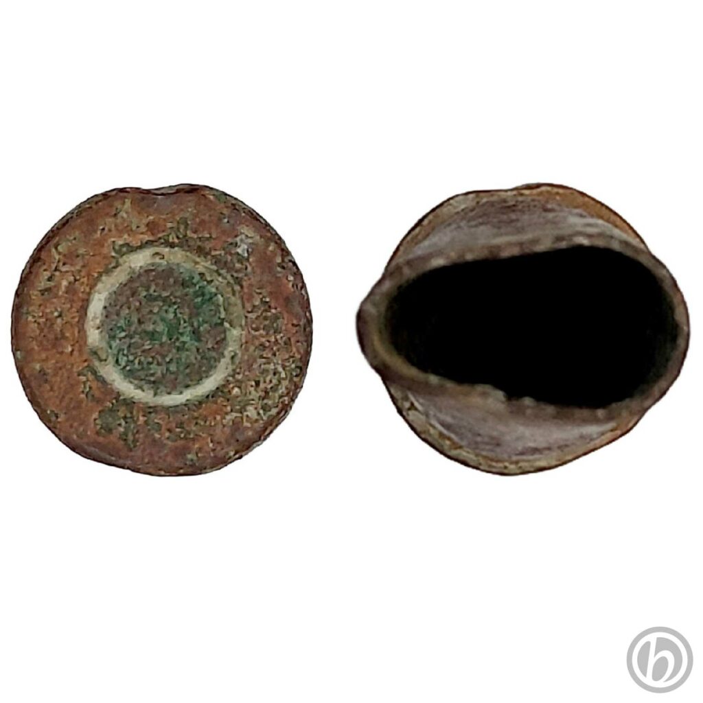 Frammento di bossolo di fucile calibro 9. Il fondello è rovinato e non sono leggibili eventuali incisioni. Il bossolo risulta schiacciato lungo un diametro.