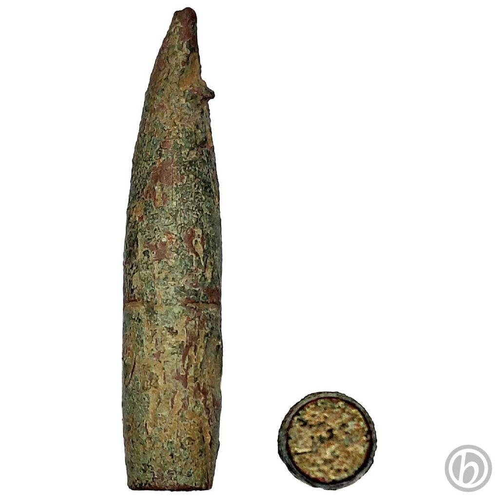 Ordinaria francese, monolitica in lega di rame. Proiettile con una discreto stato di conservazione, presenta una patina superficiale. La punta risulta schiacciata: segno che il proiettile è stato probabilmente sparato ed ha colpito un bersaglio che l’ha lesionato. Presente anello di crimpatura.