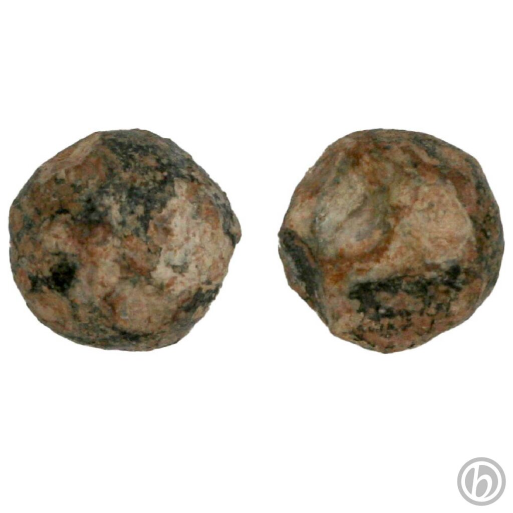 Probabile proiettile di arma ad avancarica di piccolo calibro (moschetto, archibugio, pistola), shrapnel (tipo di proiettile per artiglieria) o da caccia. Di difficile datazione, presenta una forma irregolare probabilmente dovute al fatto che il proiettile è stato esploso.