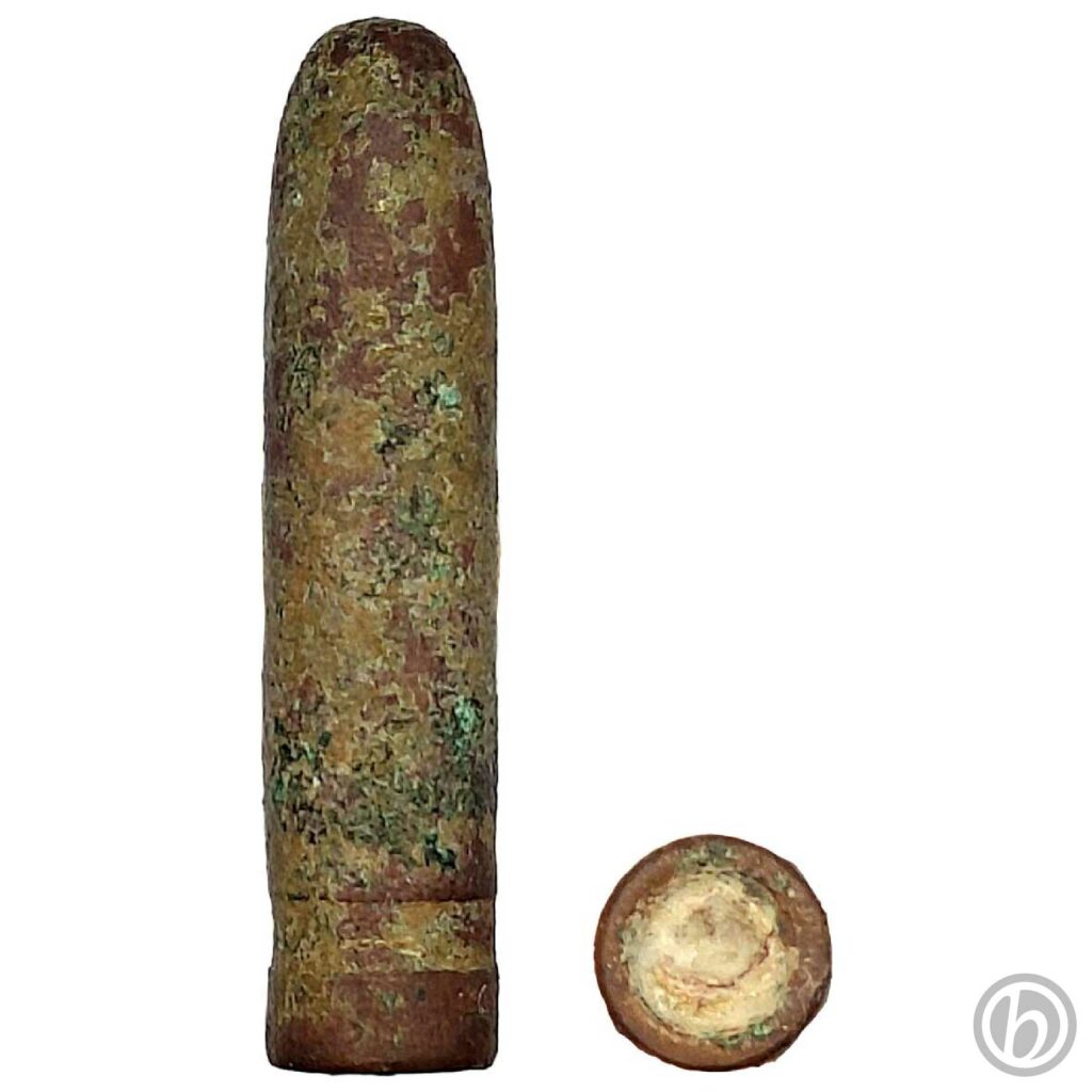 Proiettile calibro 6,5 per fucile Càrcano M.91, adottata dal Regio Esercito italiano dal 1891 al 1945. Il nucleo è realizzato in piombo e l’esterno in maillechort (o alpacca: 85% rame, 15% nichelio). Proiettile con una discreto stato di conservazione, presenta una patina superficiale e sul fondo si nota il nucleo di piombo.