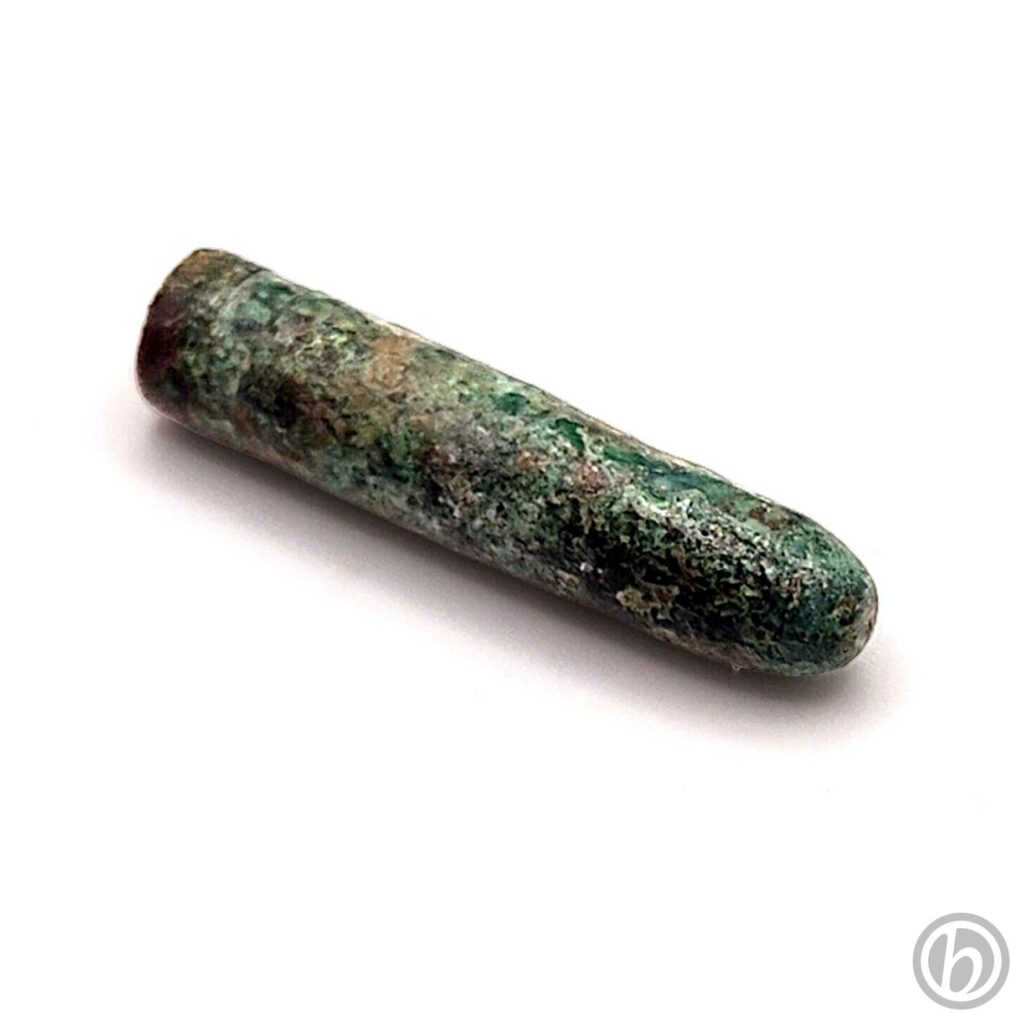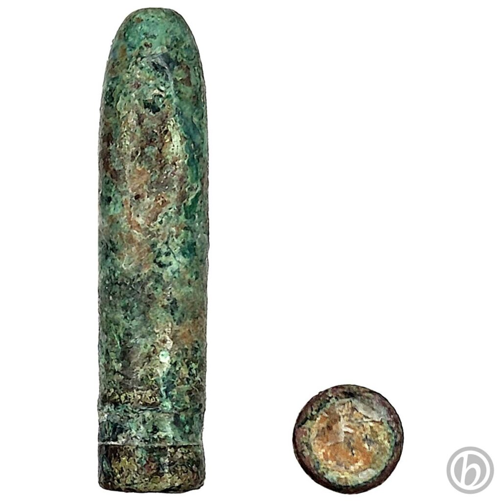 Proiettile con una discreto stato di conservazione, presenta una patina superficiale di colore verde e sul fondo si nota il nucleo di piombo.