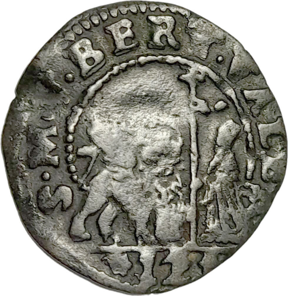 Moneta molto usurata mancante anche di un pezzo. L’esatta identificazione è stata determinata in base alle proporzioni della figura nel dritto e dal poco che si intuisce della scritta BERT.