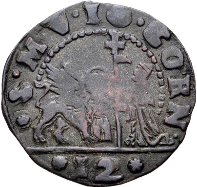 Leone di San Marco a sinistra, doge inginocchiato a destra, con in mano il bastone con croce in alto e il vessillo, valore “12” in esergo. Scritta: · S · M · V · IO · CORN · – 12
