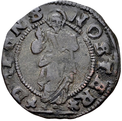 Moneta molto usurata, poco leggibile e con il profilo frastagliato e mancante in molti punti. L’identificazione è stata possibile dalle proporzioni delle figure nel dritto in relazione alle poche lettere ancora presenti e forme delle incisioni nel rovescio.