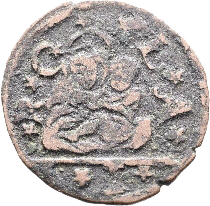 Moneta usurata e mancante di buona parte del perimetro. Sul dritto appena intuibili le due figure e visibile parte della scritta. Sul rovescio visibile il quadrato ed il leone, mancanti parte delle stelle.