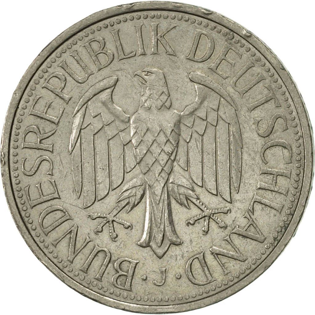 Aquila tedesca, marchio di zecca in basso. Scritta: BUNDESREPUBLIK DEUTSCHLAND – ∙ J ∙