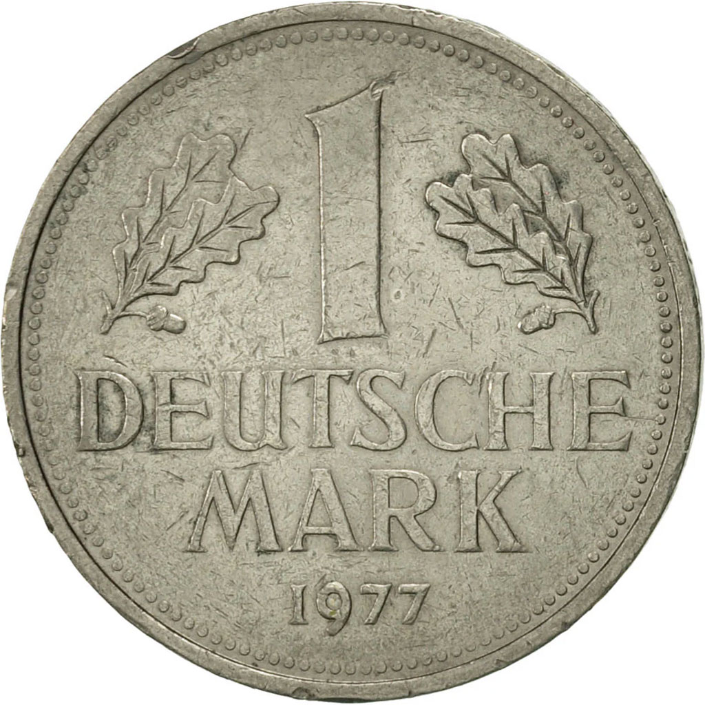 Due rami di quercia ai lati del valore nominale. Scritta: 1 – DEUTSCHE – MARK – 1977