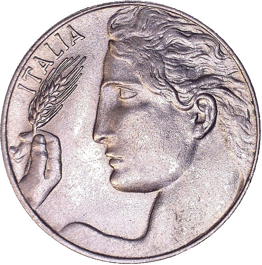 Una figura femminile sulla destra della moneta tiene in mano una spiga di grano, il nome di un paese davanti a lei. Scritta: ITALIA