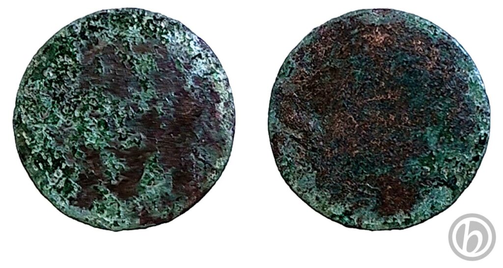 Moneta molto consumata: in alcuni punti il rame emerge dalla patina verde. Nel dritto intuibile la testa del re e parte della scritta. Nel rovescio appena visibili la stella e i due rami di alloro e quercia, illeggibili valore, anno di emissione e la zecca.Dritto