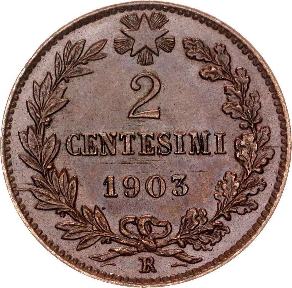 Valore e data entro due rami, uno di alloro e l’altro di quercia. Sopra la stella d’Italia e sotto il segno della zecca. Scritta: 2 – CENTESIMI – 1903 – RIncisore
