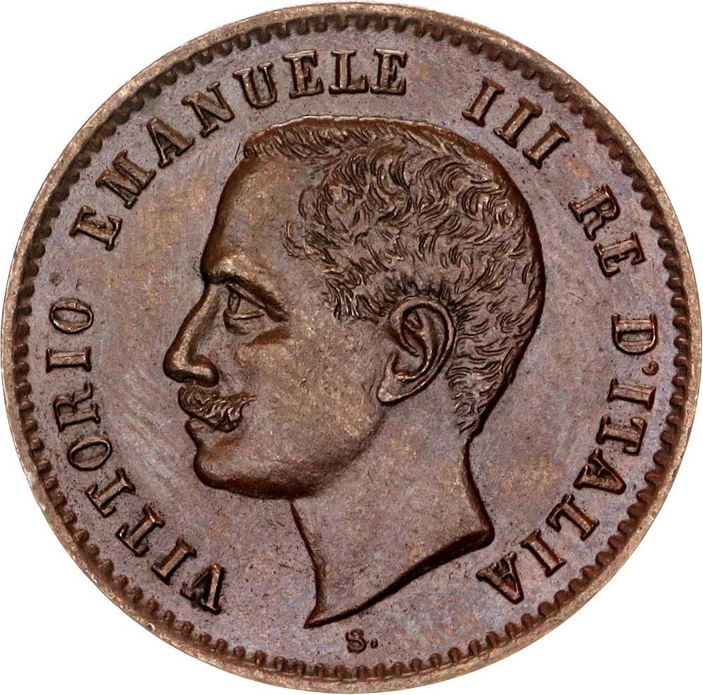 Testa del re Vittorio Emanuele III rivolta a sinistra. Sotto il collo l’iniziale S dell’incisore. Scritta: VITTORIO EMANUELE III RE D’ITALIA – SRovescio