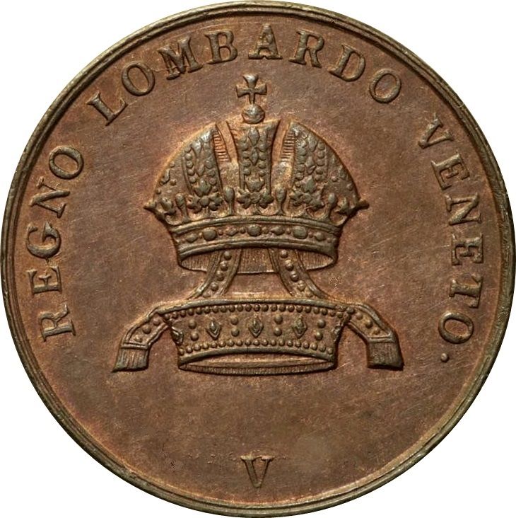 Corona imperiale austriaca, legenda e marchio di zecca. Scritta: REGNO LOMBARDO VENETO · V (Zecca di Venezia)Rovescio