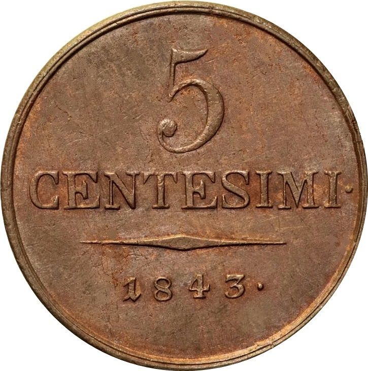 Valore scritto e numerico sopra la data. Scritta: 5 CENTESIMI – 1843 ·Valuta