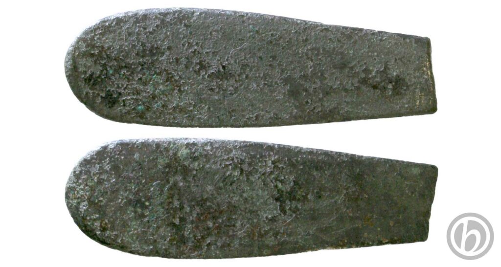 Parte terminale del manico di una posata, cucchiaio o forchetta. L’estremità presenta una cresta leggermente sollevata.