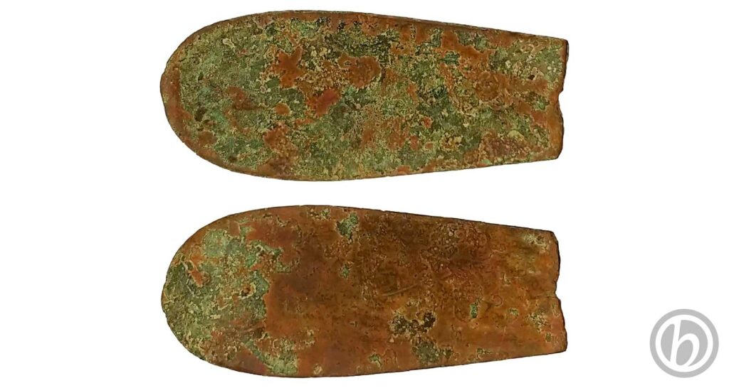 Parte terminale del manico di una posata, cucchiaio o forchetta. L’estremità presenta una cresta leggermente sollevata.