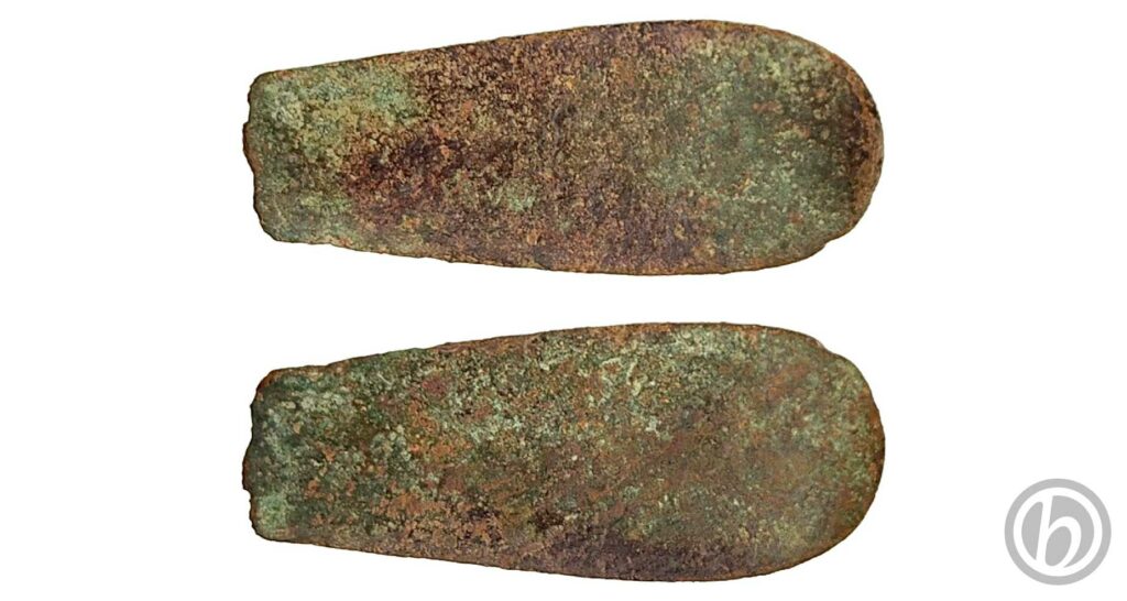 Parte terminale del manico di una posata, cucchiaio o forchetta. L’estremità presenta una cresta leggermente sollevata.
