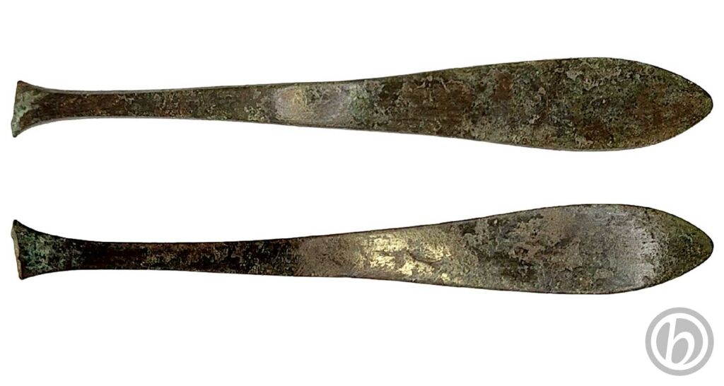 Manico completo di una posata, cucchiaio o forchetta. Leggermente piegato nella parte centrale, presenta l’estremità di forma triangolare.