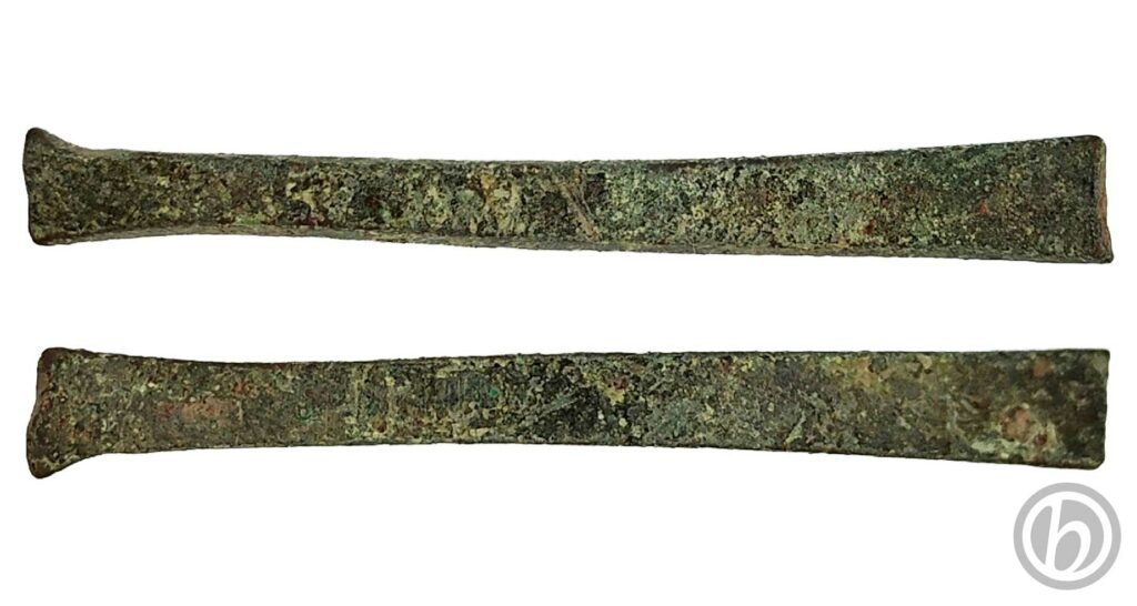 Parte iniziale di un manico di posata, cucchiaio o forchetta. Presenta una doppia curvatura.
