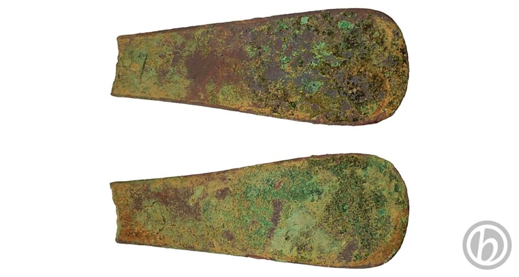 Parte terminale di un manico di posata, cucchiaio o forchetta. Presenti piccole deformazioni e curvature ed una lavorazione a doppio arco nell’estremità.