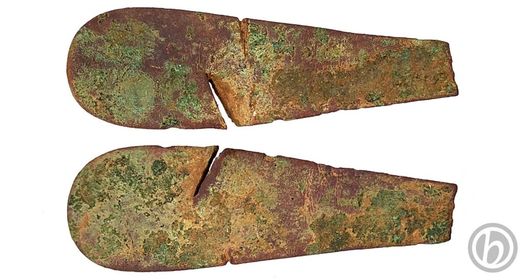 Parte finale di un manico di posata; presenta un taglio laterale ed un incisione nella faccia superiore.