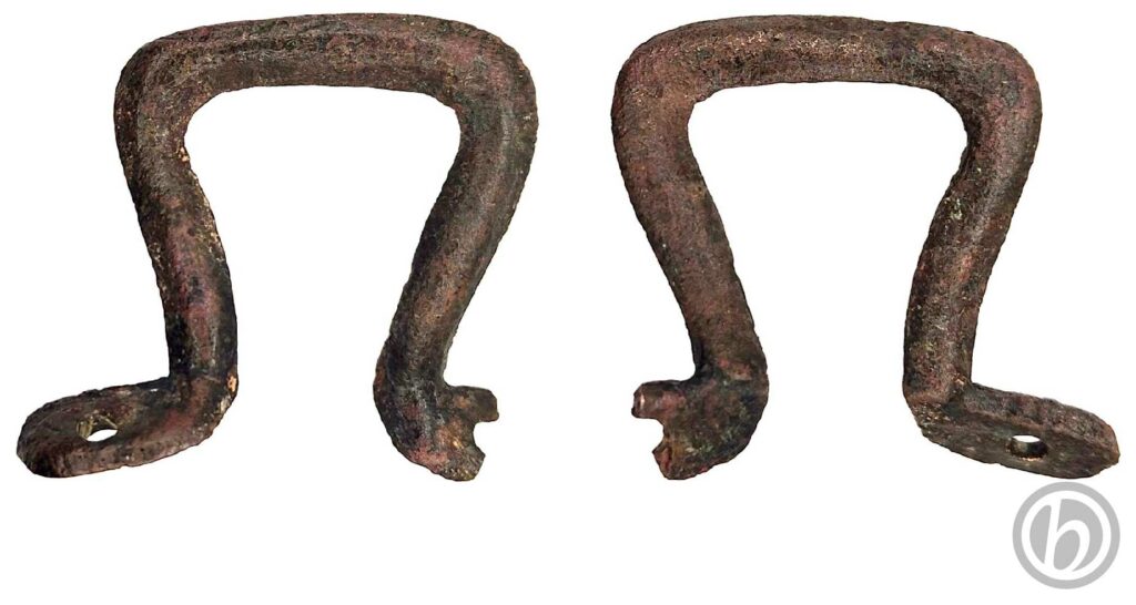 Probabile manico di una pentola. Di forma quadrata e sezione schiacciata, ha un lato piegato e manca una parte delle due estremità forate che lo fissavano al corpo della pentola.