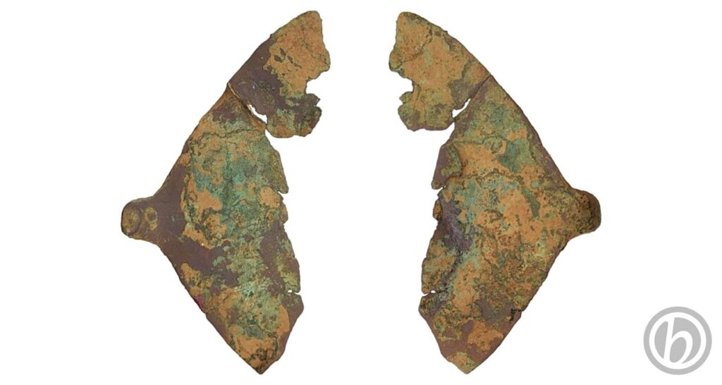 Base di una paletta di cucchiaio. Il frammento è molto incrostato, ha uno spessore molto fine e presenta crepe e pieghe.