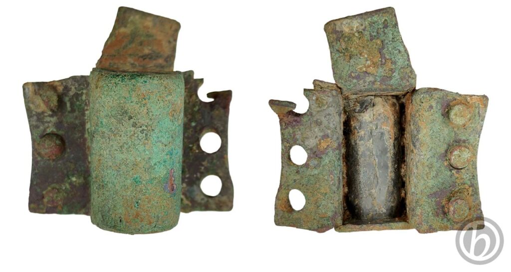 Bandella appartenuta probabilmente ad una cassa, baule o porta di veicolo. In uno dei due lati sono ancora presenti i rivetti di fissaggio, mentre nell’altro presenti i tre fori, di cui uno con una parte del perimetro aperta e piegata.