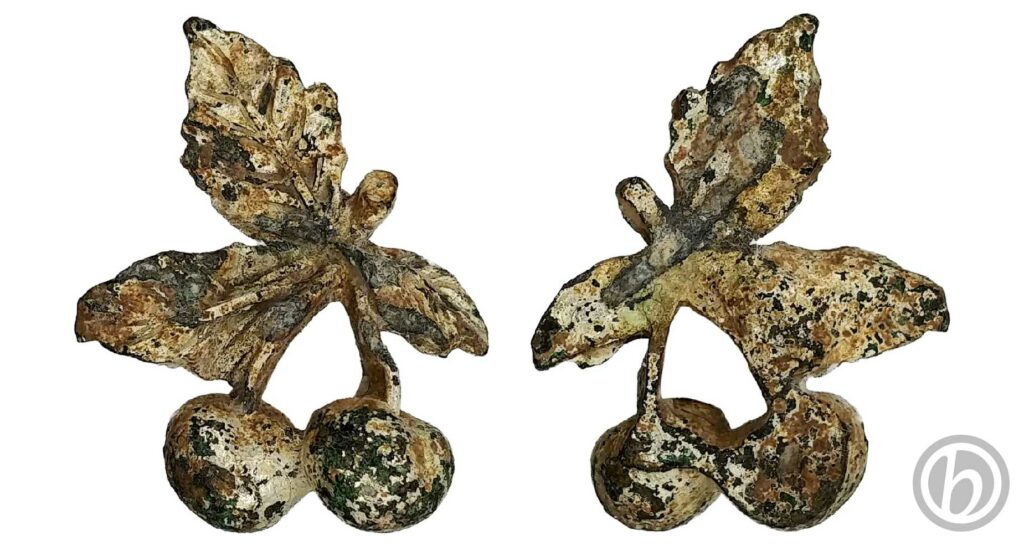 Realizzato in fusione di lega metallica, l’oggetto presenta tracce di doratura. Probabilmente si tratta di una qualche decorazione inizialmente fissato ad una superficie piana attraverso una scanalatura presente nel retro.