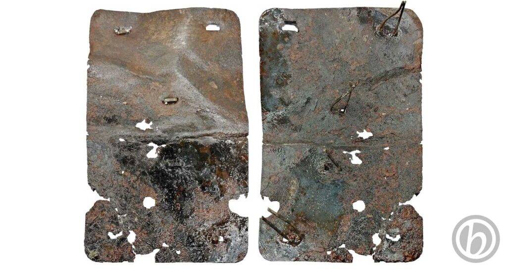 Realizzata in lamiera metallica, la placchetta risulta piegata e molto consumata. Non sono visibili scritte o altri elementi che la possano identificare ma sono ancora presenti 4 graffette con cui era probabilmente fissata ad un baule o ad una cassa di legno.