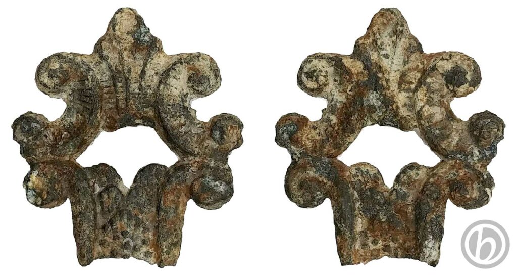 Frammento di una maniglia per anta o cassetto di mobile antico. Decorato sia nel fronte che nel retro presenta leggere tracce di doratura.
