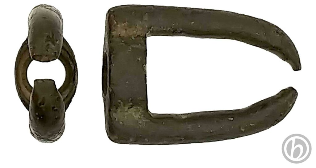 Probabile frammento dell’occhiello di un moschettone per finimenti per animali. Realizzato in materiale ferroso.