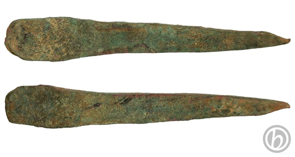 Oggetto dalla difficile identificazione. Presenta una forma asimmetrica leggermente piegata con un’estremità appuntita, l’altra arcutata ed un solco nella parte superiore.